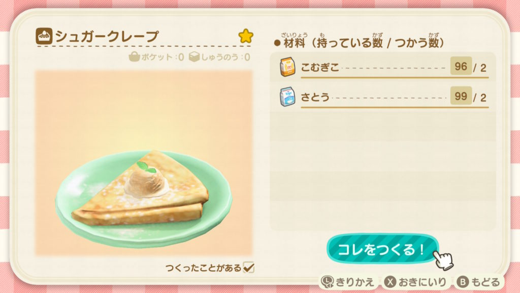 シュガークレープは210ベルのこむぎこ、さとう合わせて4つ使います。